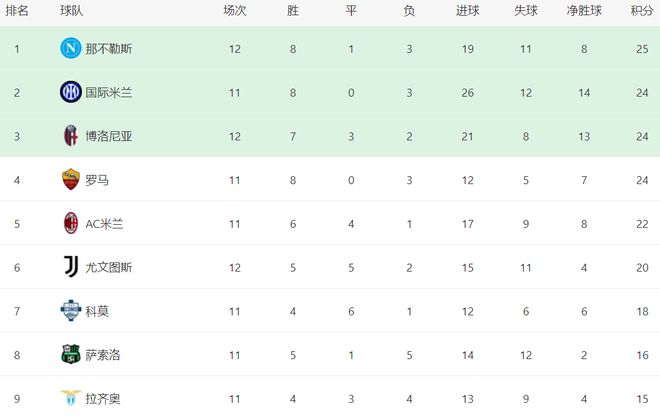在积分榜上,那不勒斯登上了榜首位置。那不勒斯8胜1平3负,拿到25分。不过,那不勒斯的榜首位置并不稳固,毕竟只领先身后的国际米兰、博洛尼亚和罗马1个积分。而国际米兰和罗马都比那不勒斯少踢1场。AC米兰以22分排名第4。尤文图斯第5名,拿到20分。本赛季的冠军争夺空前激烈,尤文图斯与榜首的差距也就只有5分而已。